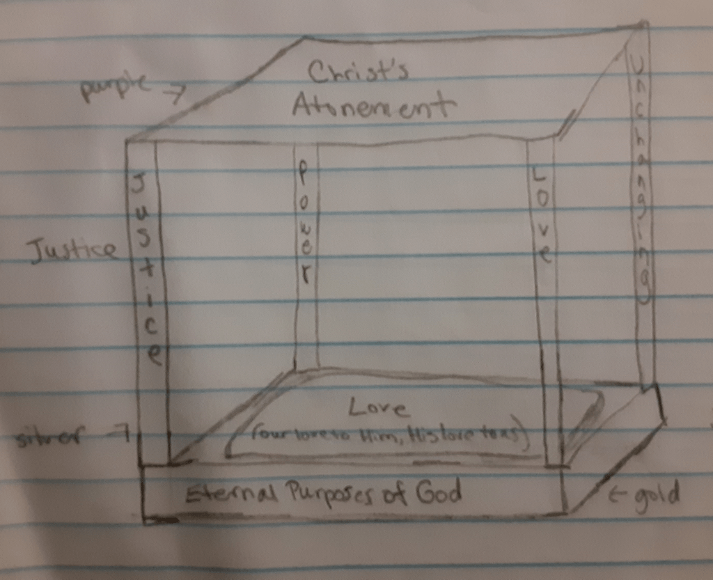 This diagram shows the symbolism of the carriage. Remember, we ride inside this carriage with Jesus. The top of it is purple and represents Christ’s atonement…we are covered by Christ’s atonement. The 4 silver pillars represent God’s justice, power, love, and immutability (God’s attribute of being unchanging). The bottom of the chariot is made of gold and represents God’s eternal purposes…we are trusting in God’s promises to us. There is a cushion of love that we sit on. It represents both our love to Christ and His love to us. We rest in His love. I will find that sermon sometime soon hopefully and we can go over the imagery more. But this gives you an idea of what to meditate on. Here is a link with images of palanquins so you can see what one would look like: Human Powered Sedans – The Story of Palanquins — Google Arts & Culture. The carriage that I drew a diagram of would look something like the carriages that are covered and would have posts that people would carry it by. You will see those when you scroll down on the page in the link.